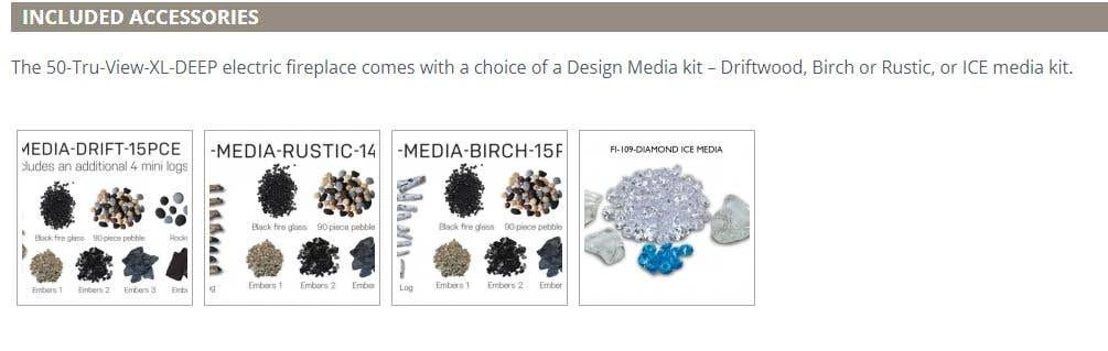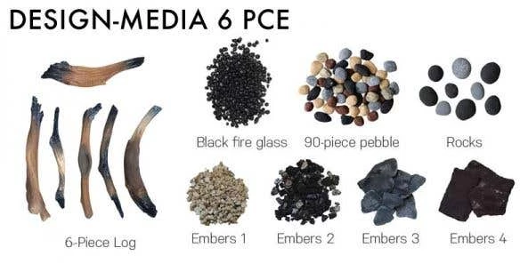 Customize the appearance of the 50-TRU-VIEW-XL-DEEP further by utilizing the included Designer Media Kit â Drift 15 piece logset with deluxe media: black fire glass, pebbles, stones and vermiculite ashes. Further media options available for additional purchase..