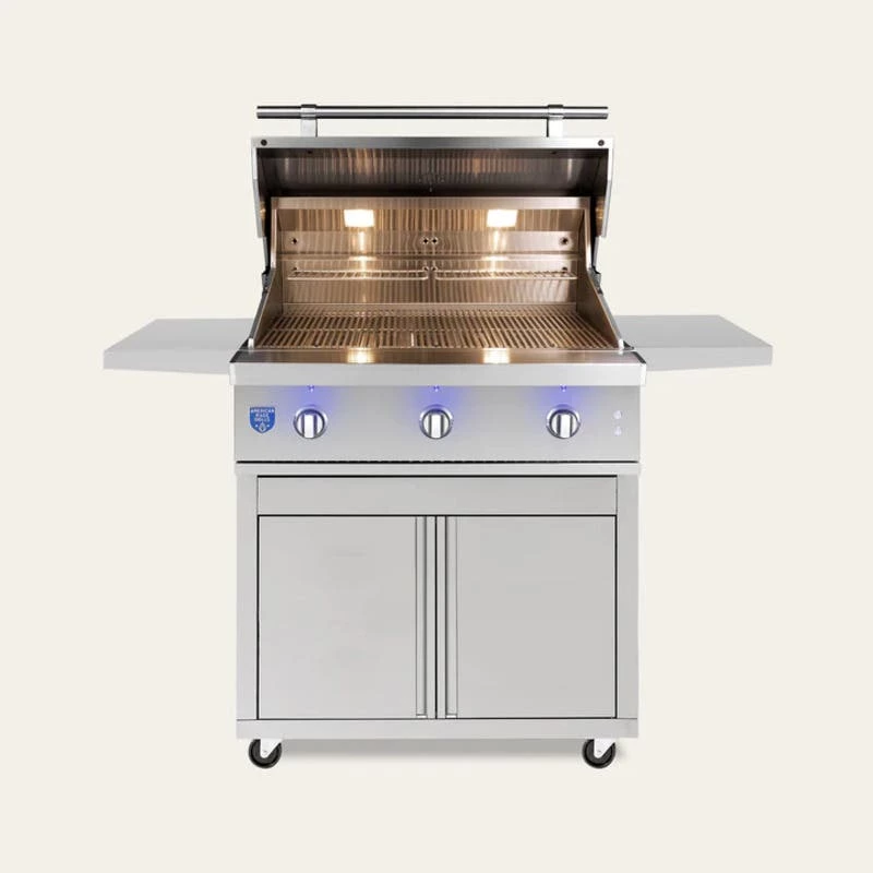 The Atlas Grill is a high-performance, luxury grill line made entirely in the USA. Made of #304 stainless steel construction, with interior, and exterior lighting, and a dual-position warming rack system. The freestanding cart for this grill features the same 304 stainless steel and offers a pair of smart side shelves and a cabinet for convenient storage.