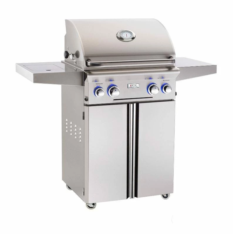 The new âLâ series grills feature an electronic push button ignition system that does not require batteries. It also includes interior halogen lights (controlled by a push button located on the right side of the unit) ideal for evening grilling. Requires 120 Volt AC power.