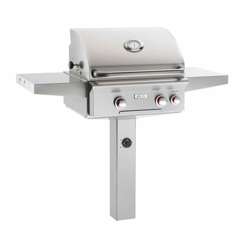 Designed for condos, apartments, or anywhere space is at a premium. The American Outdoor Grill In- Ground and Patio Post Mount units pack a lot of grilling enjoyment into smaller spaces (432 square inches). The In-Ground Grill models must be cemented into the ground. Pedestal models may be bolted to a deck or concrete slab. Both feature a backburner, warming rack and dual side shelves (standard). The optional stainless steel tank shield is designed to conceal the unsightly propane tank while a safety chain keeps the tank securely in place.