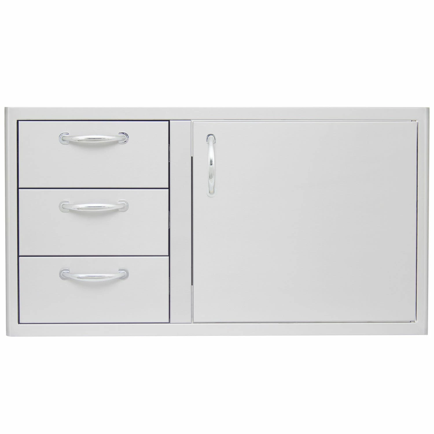 This Blaze door & drawer combo features commercial grade 304 stainless steel construction for withstanding outdoor elements and a unique completely rounded bevel design which enhances its appearance. The double-lined access door and fully enclosed storage drawers are accented with curved handles to match other Blaze products. The three drawers feature heavy duty drawer slides for smooth operation and are great for storing your BBQ tools and utensils. Blaze access doors and drawers are the perfect storage solution for any outdoor kitchen! Access Door dimensions (in inches): 19 1/4 W X 18 3/4 H. Drawer dimensions (in inches): 12 1/2 W X 5 3/4 H.