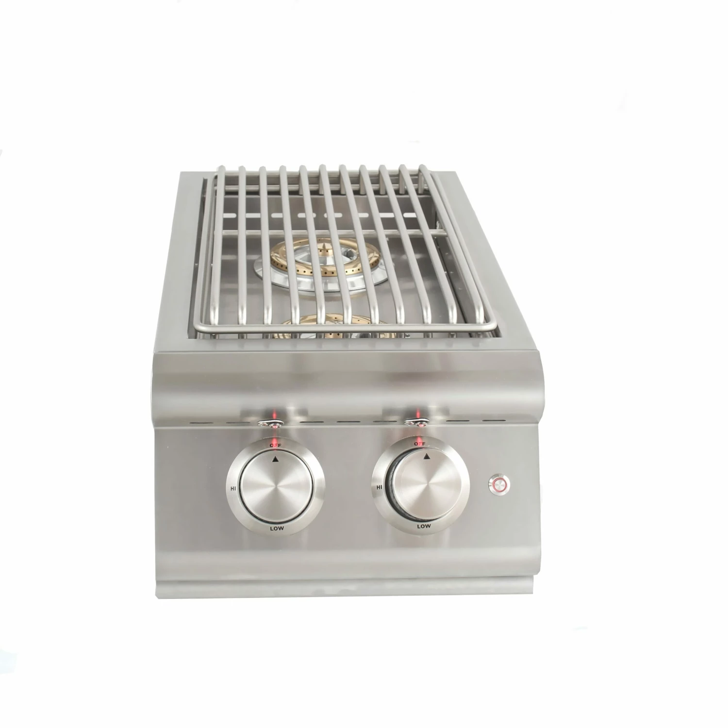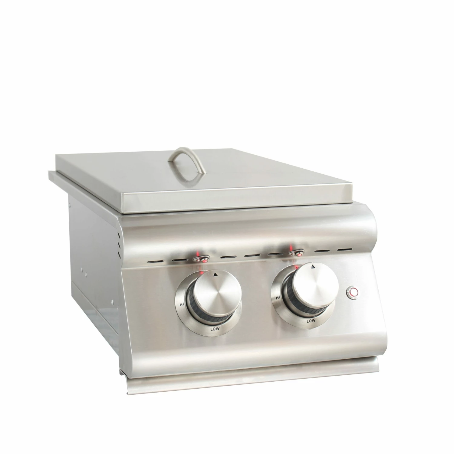 The Blaze LTE Propane Gas Double Side Burner features two heavy duty 12,000 BTU brass plated burners for enhanced performance and superior heat retention. The signature red lights match the styling of Blaze LTE grill and enhance your outdoor entertaining. This precision cut side burner is made of stainless steel and will provide you years of outdoor cooking enjoyment. The side burner features a raised cooking grate which helps provide better airflow around the burner for optimal cooking performance. The stainless steel cover protects the burner when not in use and features a curved handle to match other Blaze products. Ignition is made easy with push and turn knobs that offer a reliable flame with every start and the full-width drip tray makes clean up a breeze. If you are looking to create a gourmet outdoor meal complete with soups or side dishes, a built-in side burner is the ideal addition to your outdoor kitchen.