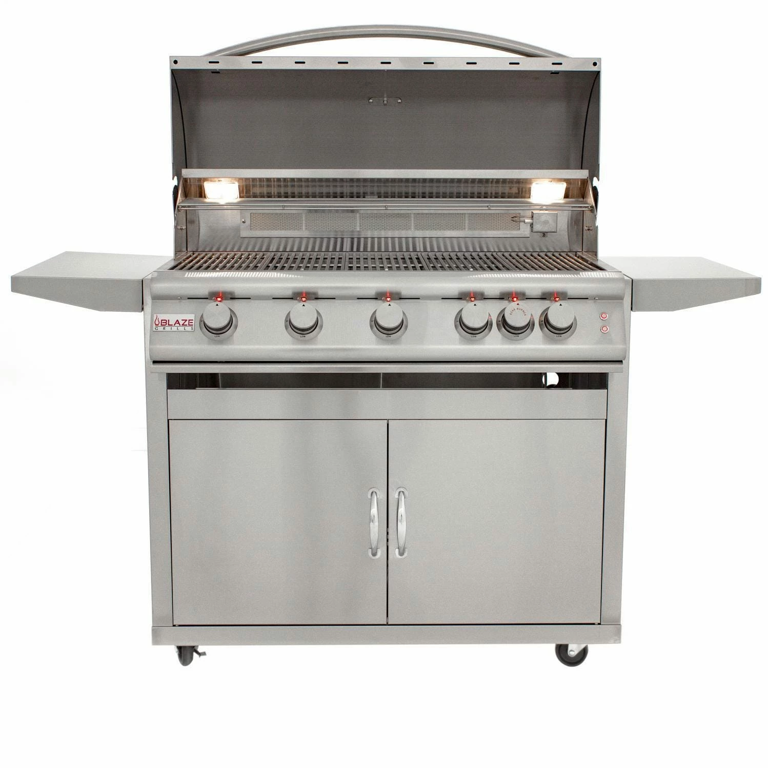 The Blaze stainless steel grill cart is specifically designed to house the Blaze 40-Inch 5 burner gas grill. The two stainless steel side shelves keep your BBQ tools at hand and provide a convenient work area while you cook. The Blaze grill cart also features two front doors with rounded handles to access the cabinet below the grill where you can store your propane tank, grill cover and BBQ accessories.