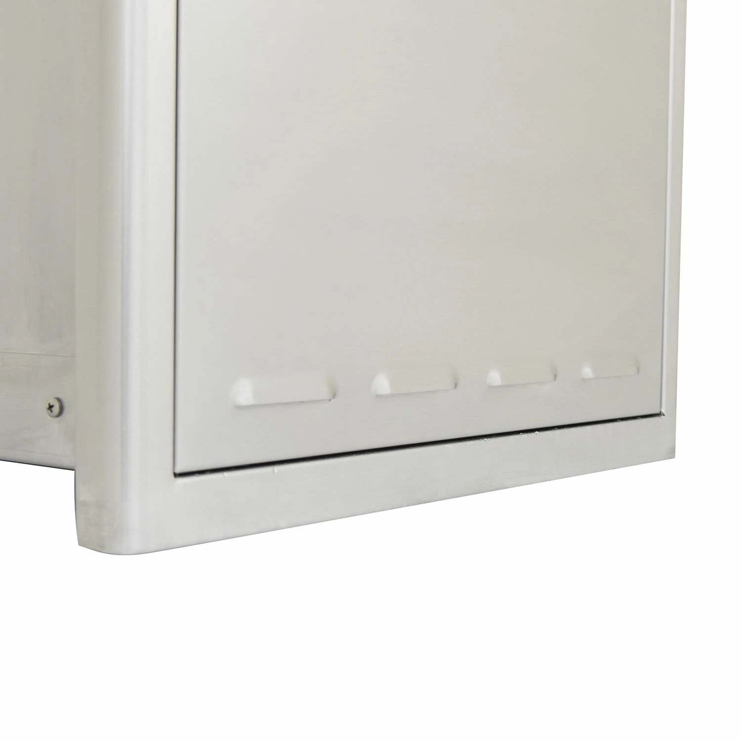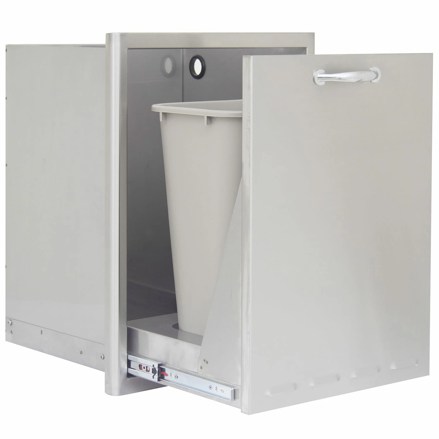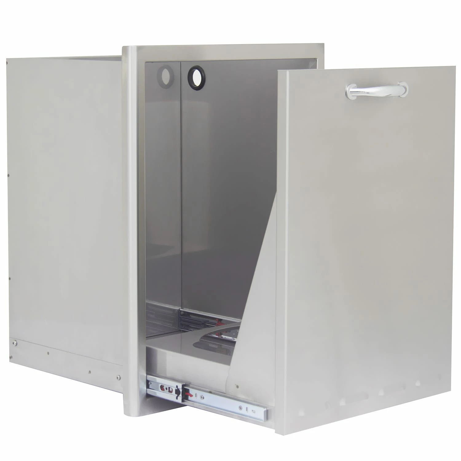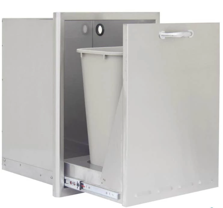 This Blaze trash bin features commercial grade 304 stainless steel construction to withstand outdoor elements and a unique completely rounded bevel design that enhances strength and durability. Conveniently hide the bin and gain easy access to the trash by pulling the roll out drawer open. The drawer can also be used to store a standard 20 pound propane tank. This quality outdoor kitchen trash bin is double-lined and accented with a curved handle. A 42 quart trash bin is included with this drawer. Blaze storage drawers are the perfect storage solution for any outdoor kitchen!
