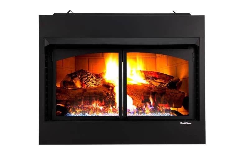 Model ZCBBXL 42″ zero clearance fireplace. This fireplace is intended to be installed into a wood framed cavity in new construction, remodel, or can be purchased with a mantel cabinet. The ZCBBXL produces 40,000 BTUs and burns 99.9% efficiently. This deluxe vent free fireplaces comes with Buck Stove’s Embervision Oak vent free natural gas logs, an remote to turn the flames on and off, a heat activated – heat circulating blower kit, and mesh screen doors.