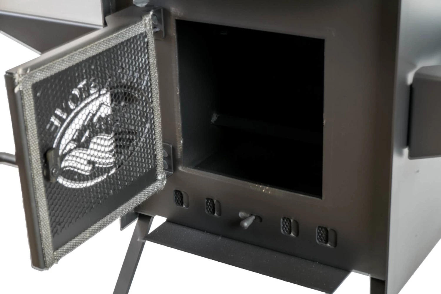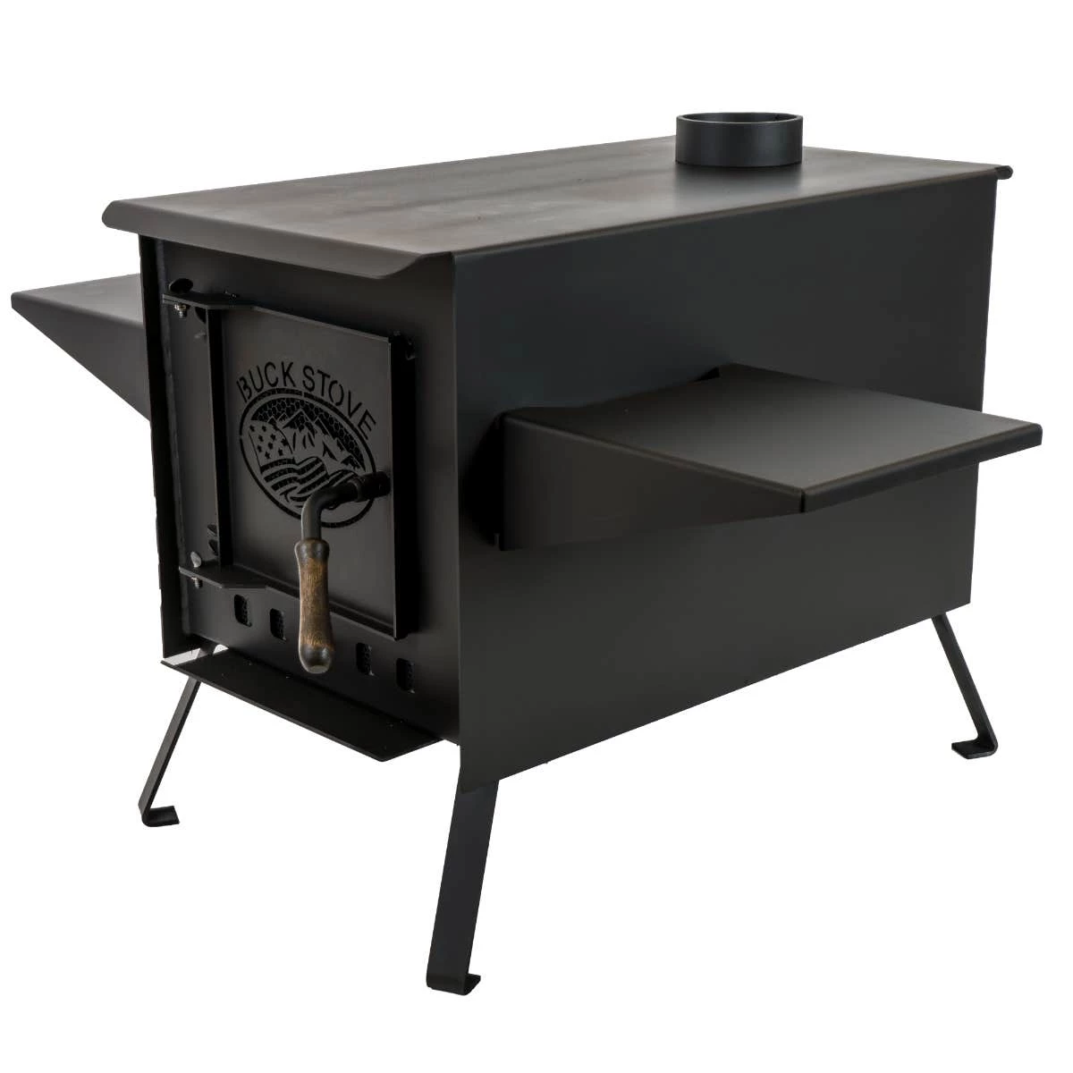 Each Buck Camp Stove has built in fire dogs and optional side shelves for the total camp stove package. Assembly takes just minutes and legs come off easily for storage inside the stove. Easy grasp handles for transporting