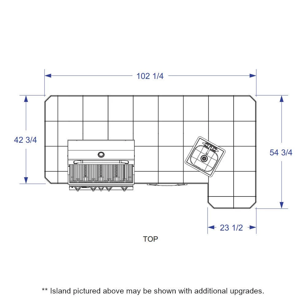 - Island Dimensions: Main Body: 102 1/4″W x 42 3/4″D x 39″H