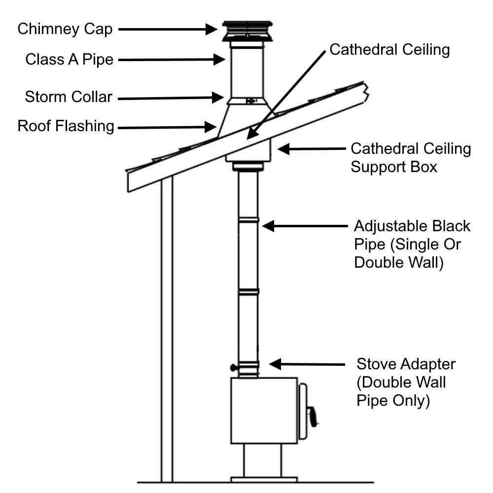 - 44″-68″ Adjustable Black Pipe Plus And Additional 12″ Pipe Connects The Stove To The Cathedral Ceiling Box For Up To A 9FT Ceiling