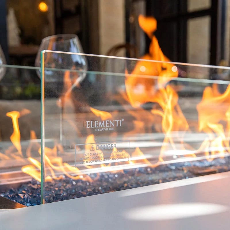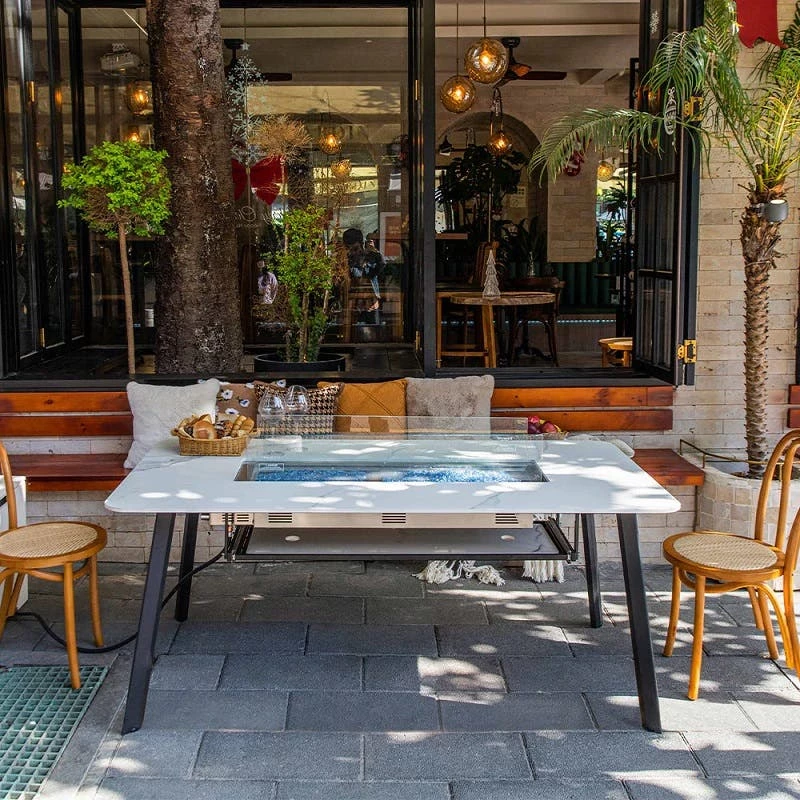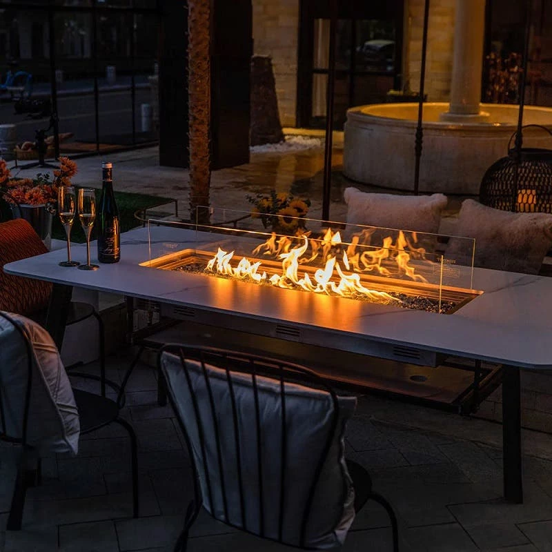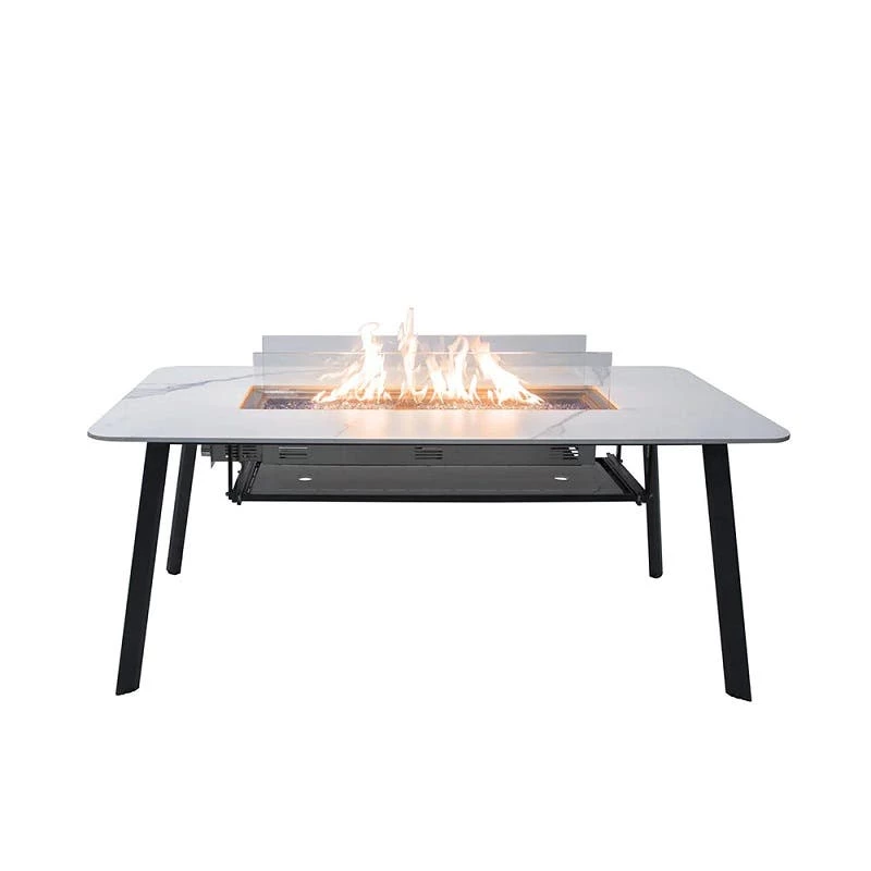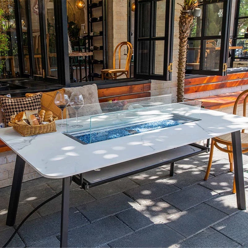 - Stunning Fire Glass: Caribbean blue fire glass, weighing 19.8 lbs (9 kgs), is included to elevate the visual spectacle of the fire feature.Elegant Design: The marriage of marble porcelain and sturdy metal creates a dining table that’s not only functional but exudes elegance and style.