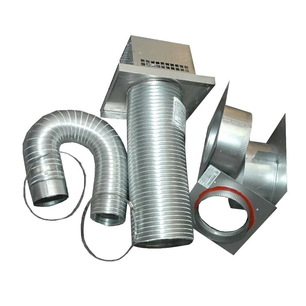This kit includes 4ft of 4″” x 7″” flexible venting, horizontal cap, wall thimble, collars, and gear clamps.
