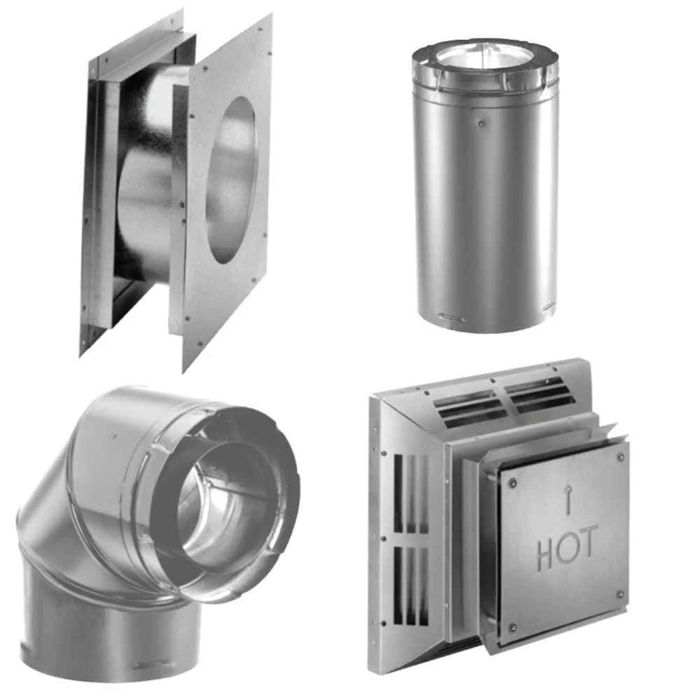 - Includes: 90 degree elbow, horizontal cap, wall thimble, and 6″ pipe.