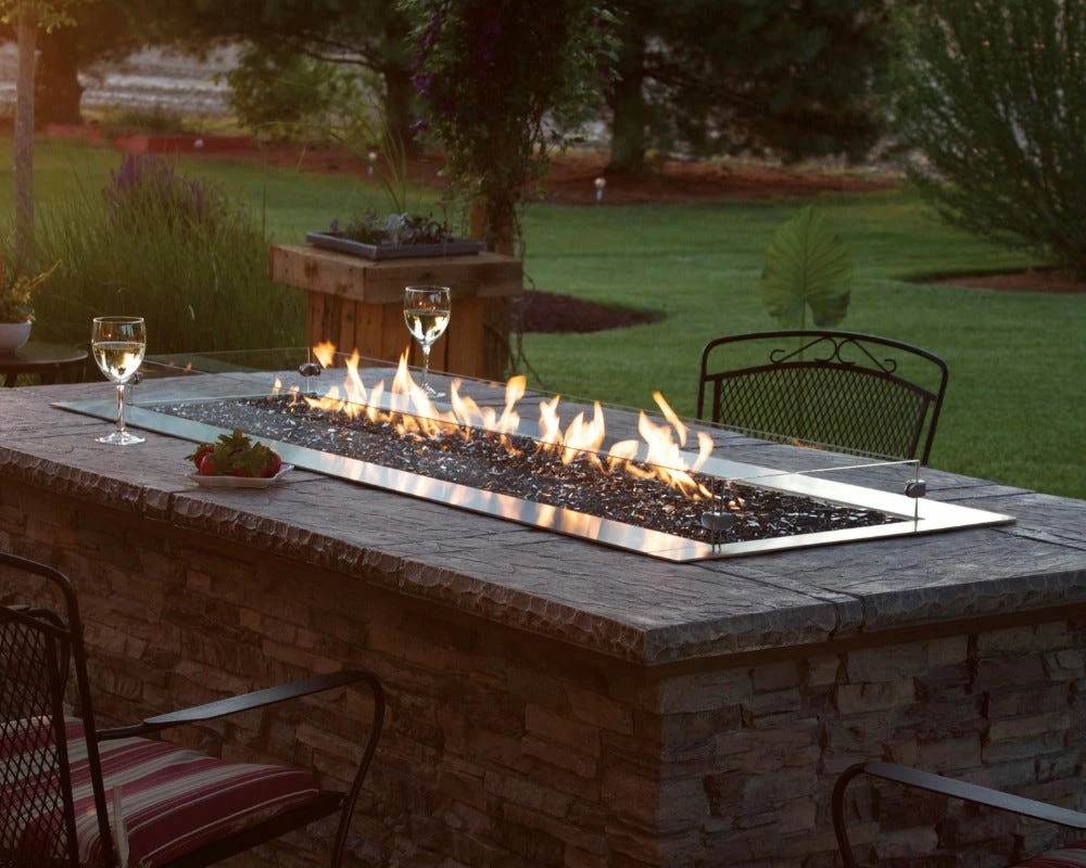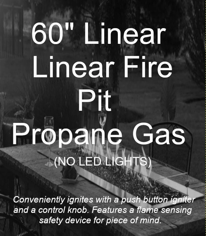 The Empire Carol Rose line of linear fire pit burners will captivate you with their mesmerizing flames. Constructed of stainless steel and designed to impress. Available in 48″ and 60″ lengths. Each size available with or with out LED lights. The LED lights are below the fire glass and will brilliantly illuminate the glass in different color options to match the mood of your evening. Each fire pit utilizes a push button flame sensing ignition system that will shut the gas off should the flames blow out. Make this stylish and safe fire pit burner the center piece of your outdoor living space.