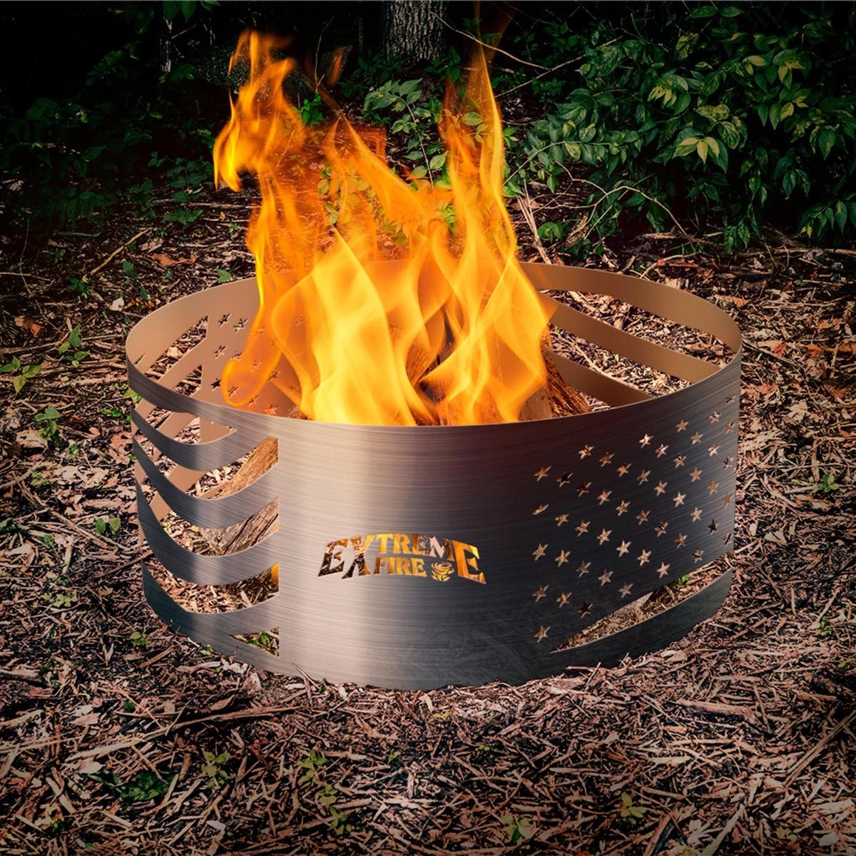 The Extreme Fire âAmerican Flagâ Steel Fire Ring is built to last, with uncoated steel that weathers over time to a natural, rust-colored patina. These stunning designs will look great in every backyard. Made in the U.S.A. from rugged and durable 14-gauge steel.