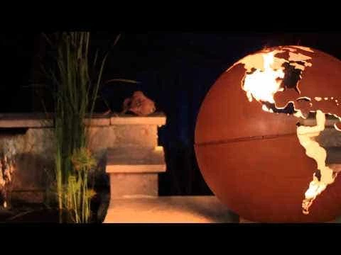This large orb is relieved of the earth features and promotes the watery two thirds of our planet in steel. When afire this design highlights the earths fiery inner core.
