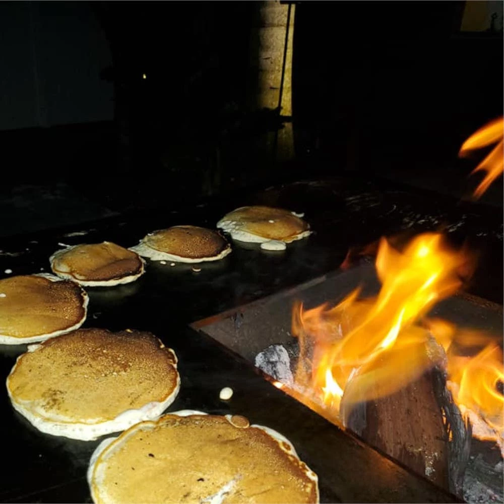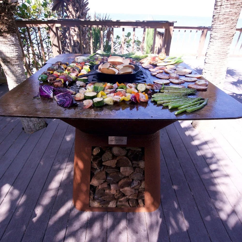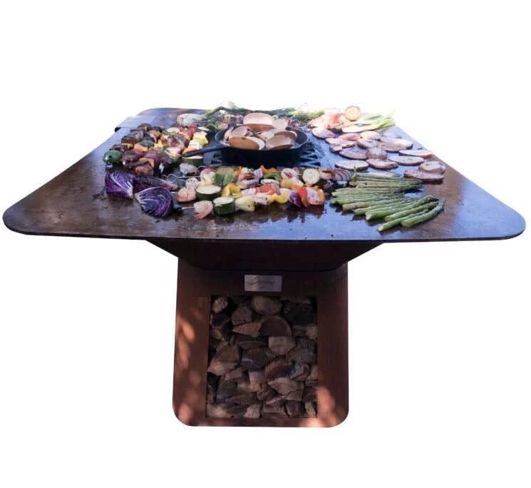 Pre-weathered corten steel base and fire bowl, 1/2″ carbon steel cooktop with grate. Made with weather resistant materials and can be left outdoors in all weather conditions. The three-part design makes it easy to transport. No required maintenance for base or fire bowl. After every wood-burning use scrape food residue into the fire and wipe cooktop with cooking oil.