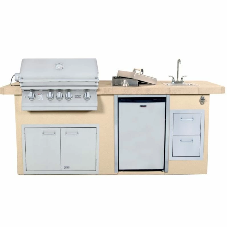 Lion Premium Grills is an industry leader in the outdoor kitchen industry. Manufacturing BBQ islands, BBQ Grills, BBQ Island Accessories, And Freestanding Grill Accessories . When you build your products out of only the best materials you can back those products with some of the industry’s best warranties. Their 304 stainless steel grill bodies, 304 stainless steel rod cooking grids, and 304 cast stainless steel burners all have a lifetime warranty. Lion also offers outdoor necessities like a refrigerator, beverage center, side burners, access doors, storage drawers, and more. Currently, each and every Lion comes standard with Lion’s Gourmet Cooking Package which includes: a griddle that replaces a standard cooking grid, a grill head cover, the rotisserie burner, rotisserie with motor, a smoker box, and a cooking grid lifter that is also a bottle opener. Add these features with Lion’s standard of quality and you get the recipe for the best value in the grill business.