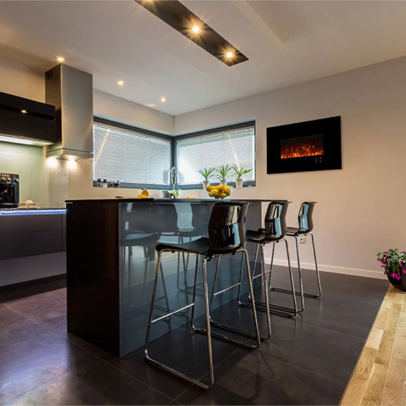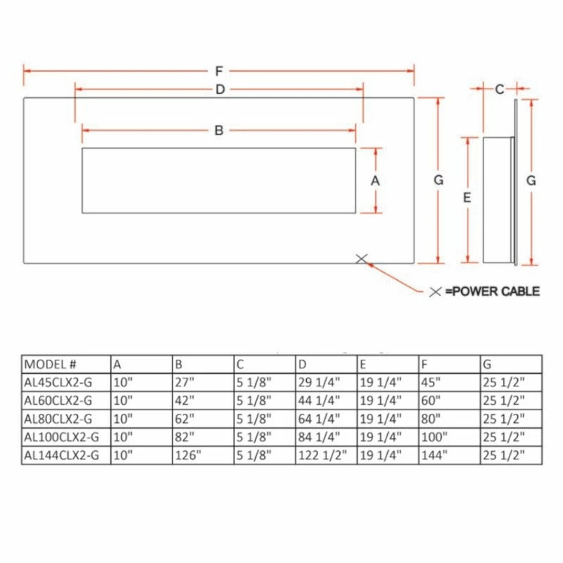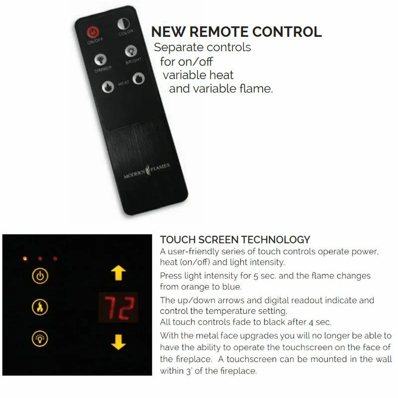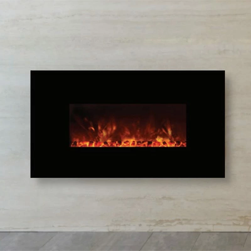 The Ambiance CLX2 45 fireplace can either be hung on the wall or recessed into a 2″ x 4″ wall. The Ambiance CLX2 45 fireplace includes a black glass surround with a touch screen control as well as a remote control. Each fireplace comes standard with remote control as well.