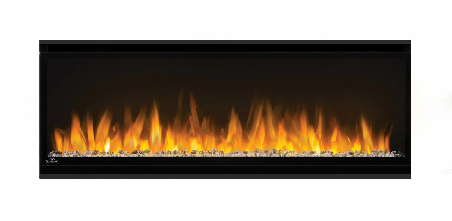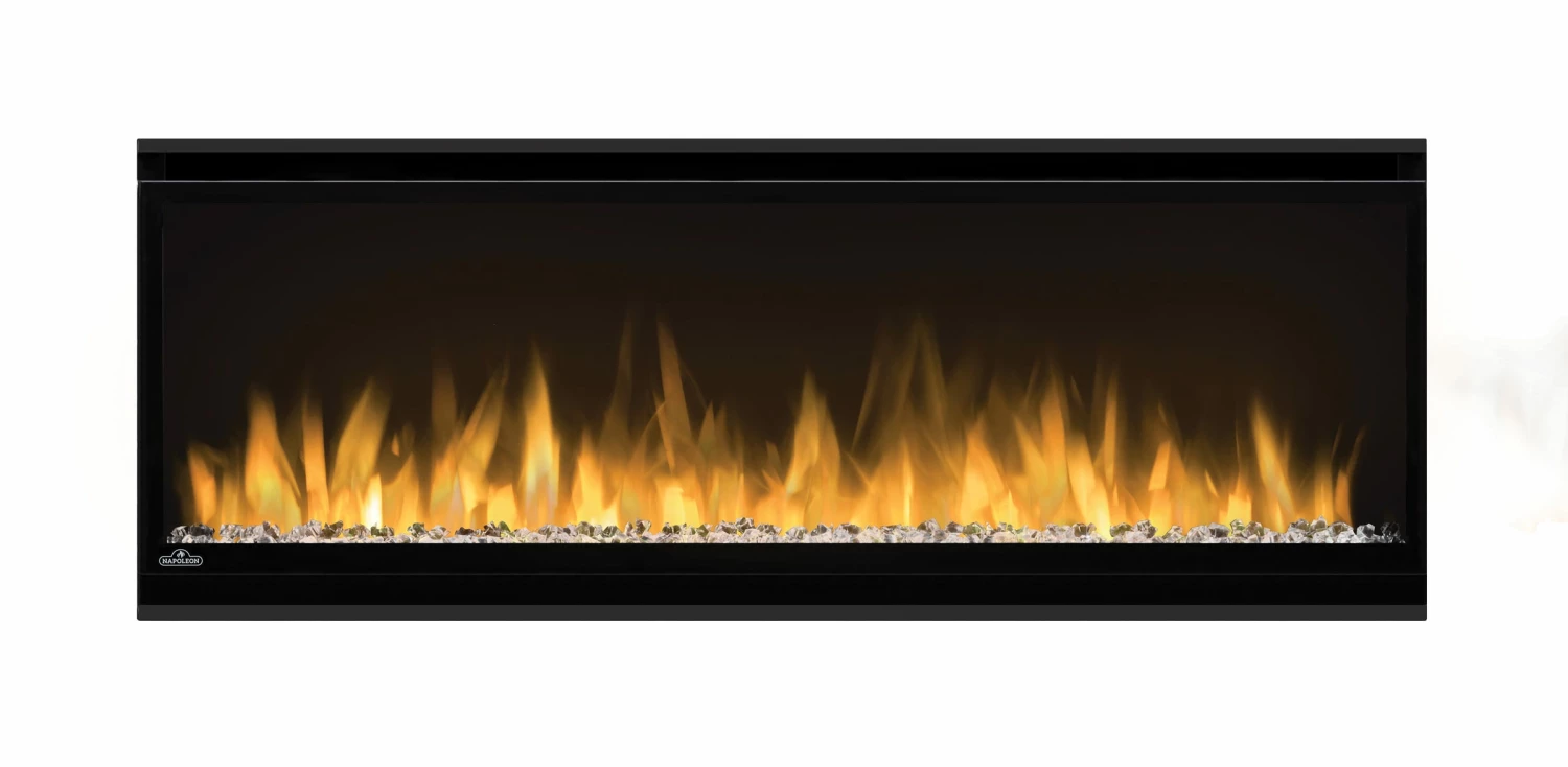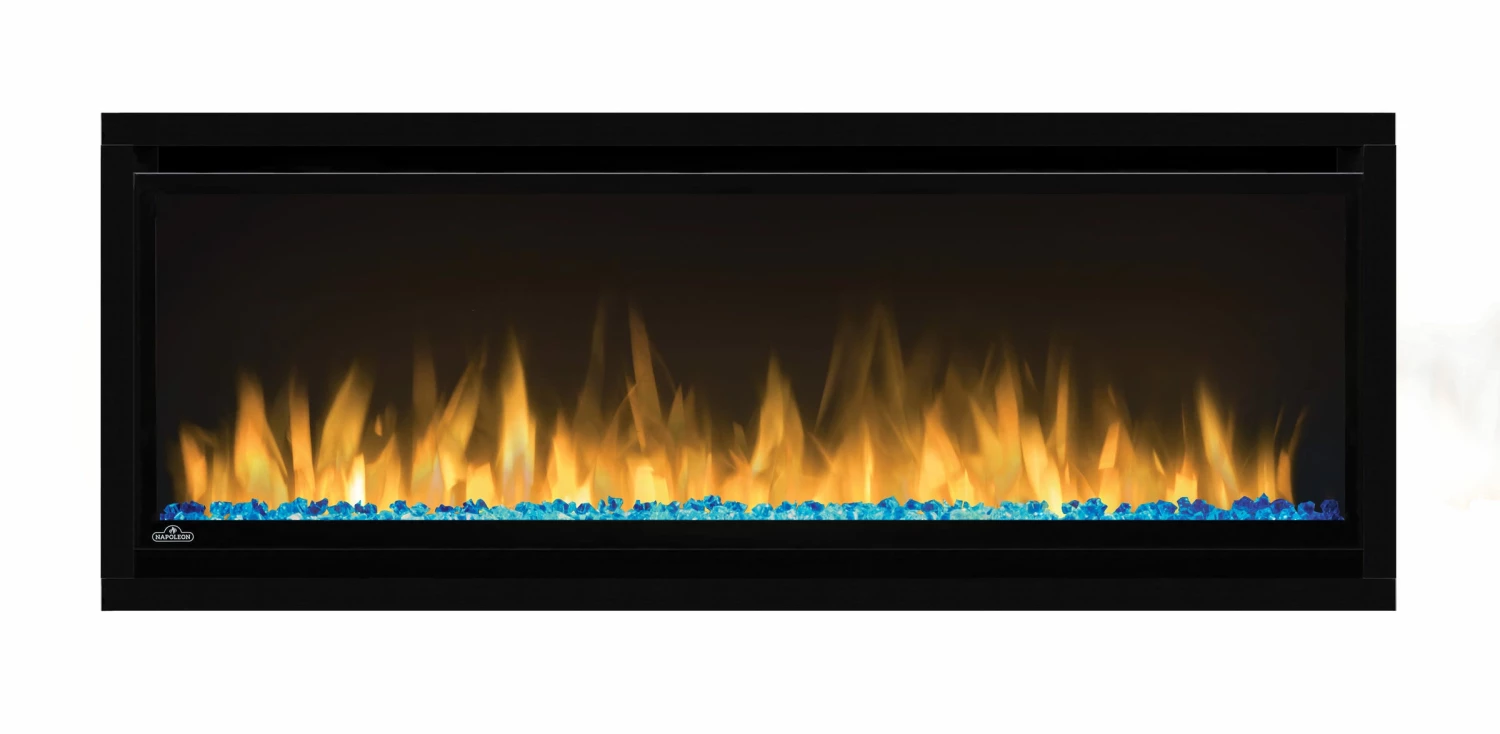 See the fireplace, not the frame with Napoleonâs Alluravision Series linear electric fireplaces. They stand out from the rest with their nearly frameless viewing area which highlights the unique flame colors. Set the mood with yellow, orange, blue and multicolor flames with the push of a button. Easy to use, these electric fireplaces are plug and play – just hang on the wall and plug them in. The Alluravision Series can also be hardwired to 120 v (slim) or 240 v (deep models). Three sizes, 42, 50, and 60-inch, come standard with a crystal media ember bed and remote control. The NIGHT LIGHT and glass media with driftwood make beautiful additions to the deep model. Napoleonâs Alluravision Series linear electric fireplaces are about adding the fireplace, and not the frame to your favorite room.
