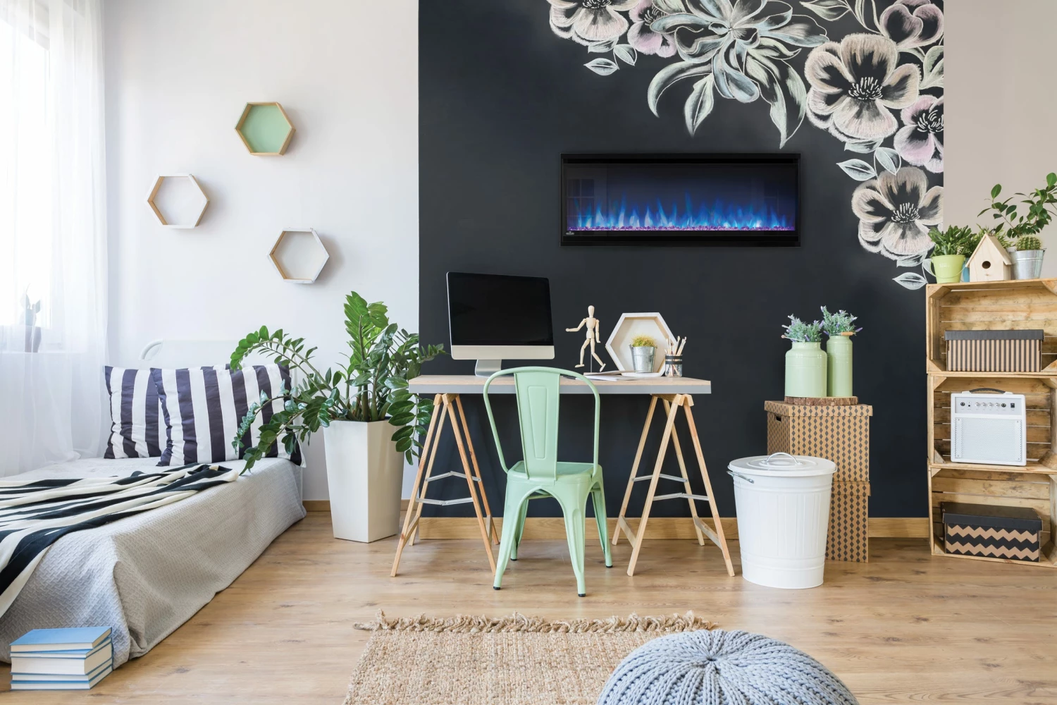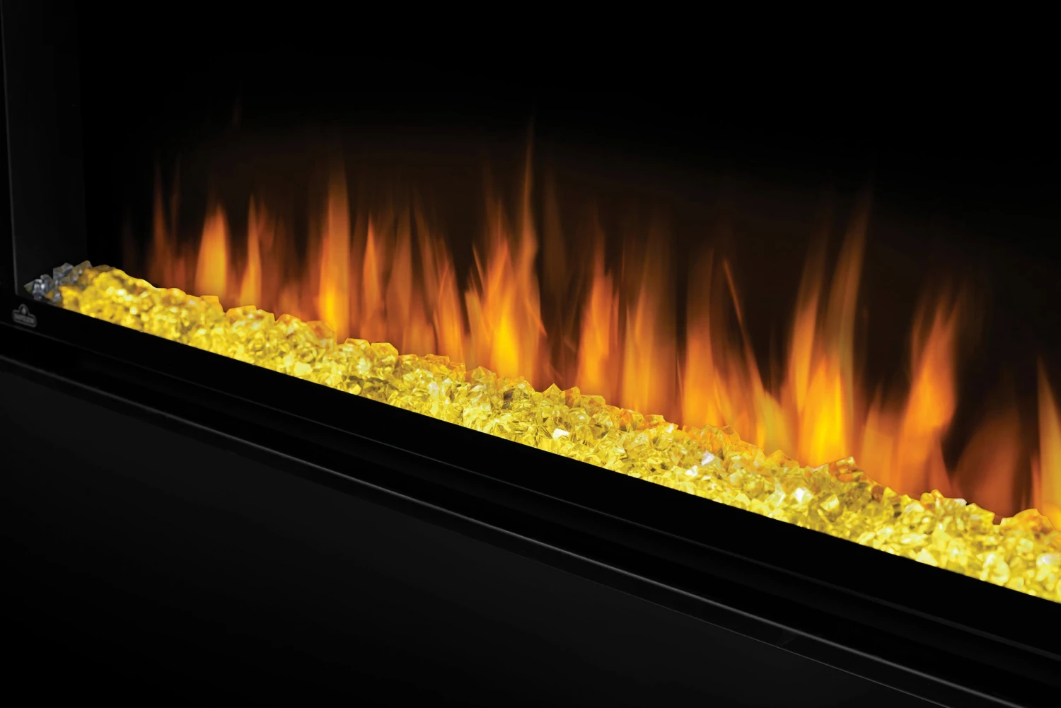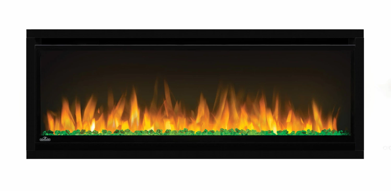 See the fireplace, not the frame with Napoleonâs Alluravision Series linear electric fireplaces. They stand out from the rest with their nearly frameless viewing area which highlights the unique flame colors. Set the mood with yellow, orange, blue and multicolor flames with the push of a button. Easy to use, these electric fireplaces are plug and play – just hang on the wall and plug them in. The Alluravision Series can also be hardwired to 120 v (slim) or 240 v (deep models). Three sizes, 42, 50, and 60-inch, come standard with a crystal media ember bed and remote control. The NIGHT LIGHT and glass media with driftwood make beautiful additions to the deep model. Napoleonâs Alluravision Series linear electric fireplaces are about adding the fireplace, and not the frame to your favorite room.