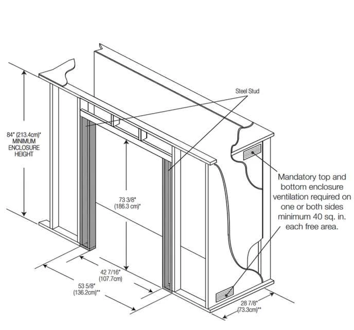 - Framing Dimensions: 42 4/16″W To Steel Studs x 54 7/16″W To Wood Studs x 73 5/8″H x 28 7/8″D