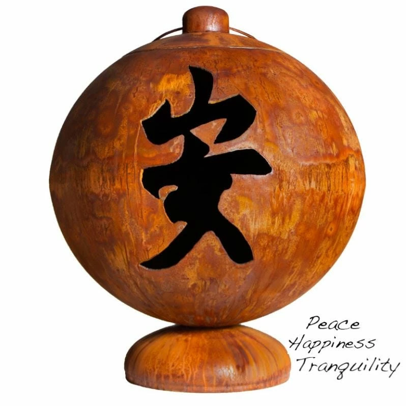 The Peace, Happiness, Tranquility Asian Inspired Fire Globe by Ohio Flame is a unique Fire Feature and artistic sculpture designed to bring the serenity of Asian design to your outdoor space. This elegant Fire Globe displays a triptych of Japanese kanji for âPeaceâ, âHappinessâ and âTranquility.â The design mimics the Japanese paper lantern and features a hinged access door with a handle. As part of the Skillman Signature Series, this creative Fire Feature is creation of local artisan, Matt Skillman. He handcrafts each of these unique Fire Globes, ensuring that they are built with quality and durability. With no parts to break or wear out over time, this Artisan Fire Globe is built to last a lifetime. Peace, Happiness, Tranquility is crafted from thick carbon American steel that is sourced from local steel mills. No maintenance is required for this Fire Bowl, as itâs designed to withstand the elements year-round. Peace, Happiness, Tranquility features a substantial Rain Drain to allow for water drainage. The Patina Finish features a natural iron oxide patina that will gradually darken over time. This Fire Globe is 100% American Made and is crafted by a local artisan. Peace, Happiness, Tranquility is backed by Ohio Flameâs Lifetime Warranty, guaranteeing that the Fire Globe will last a lifetime.