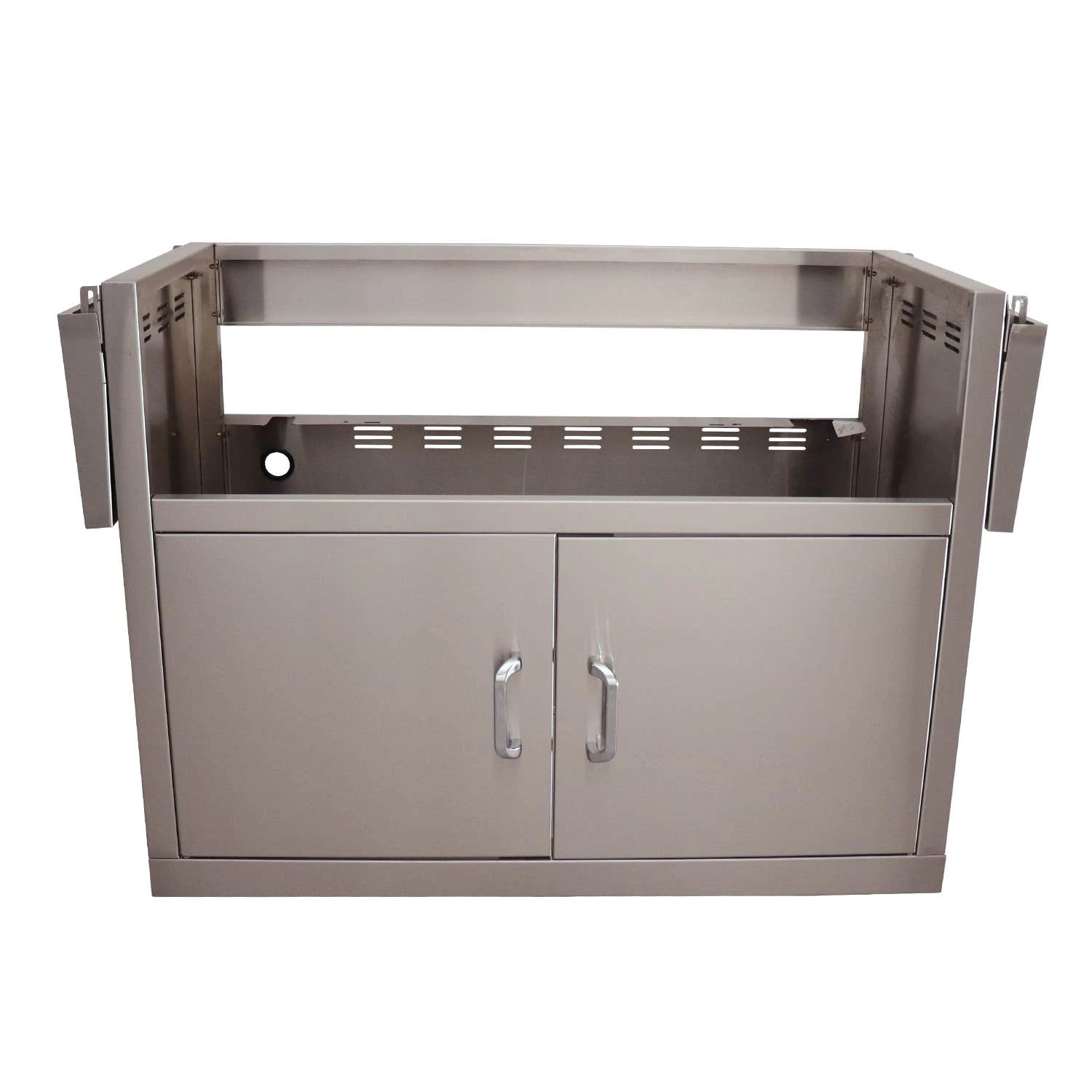 This RCS stainless steel grill cart is designed to house the RCS Cutlass Pro 38-Inch gas grill. Its features include stainless steel side shelves that fold down, double access doors, a slide-out tank tray, and swivel caster wheels. Its stainless steel construction ensures long-lasting durability for years of outdoor use.