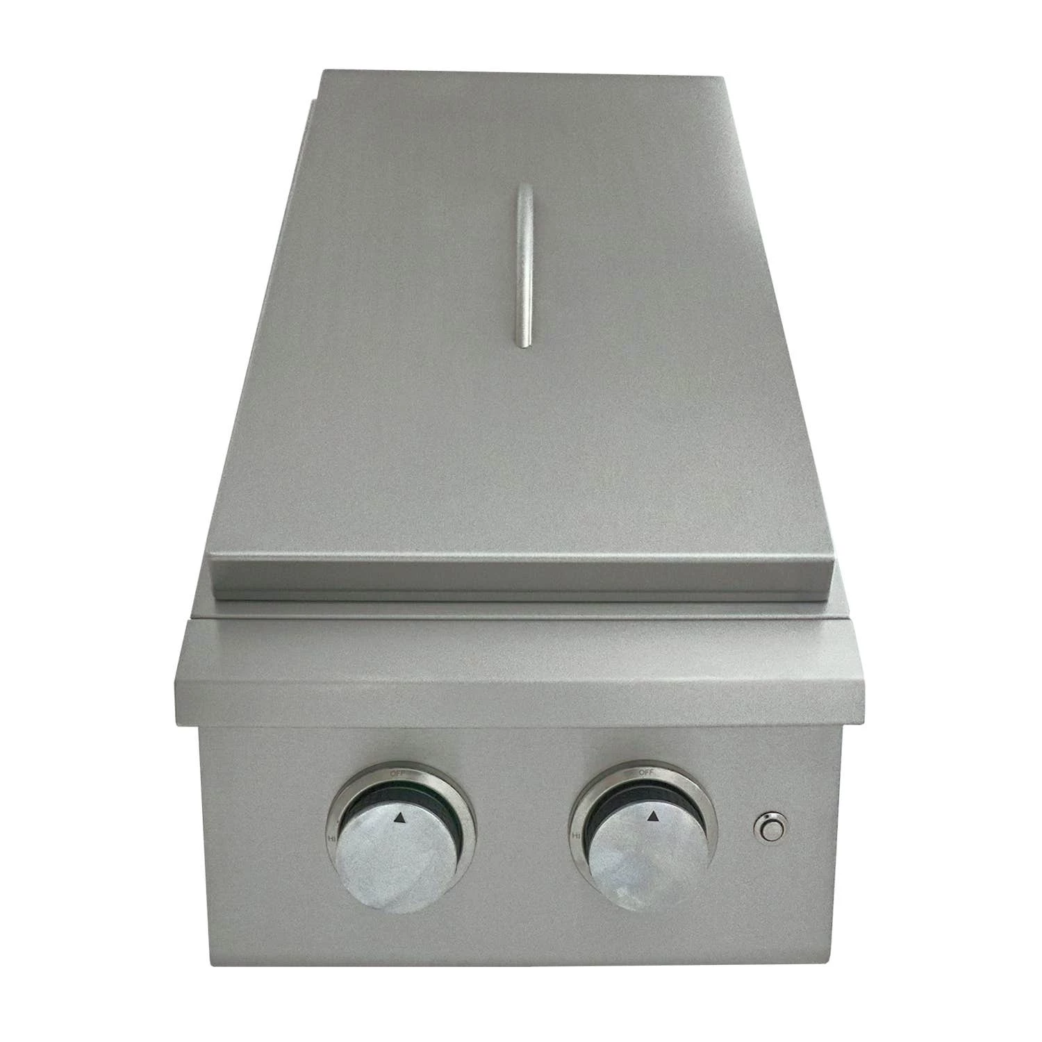 Enhance your outdoor kitchen with the added benefit of an RCS double side burner. This natural gas double side burner enhances your outdoor cooking options by providing two (2) burners that push 12,000 BTUs (each) of cooking power to your outdoor kitchen. Blue LED lights accent the control knobs for a look that stands out. The side burner must be plugged into an RCS Premier Series grill with lights for the side burner lights to work. The easy-start ignitor and clean-burning propane gas will get your cooking started quickly. A built-in design makes this side burner an easy upgrade to any RCS outdoor kitchen. The 304 stainless steel construction outlasts inferior brand designs, and the included stainless steel lid extends the life of this unit, making this the last side burner you will ever need!