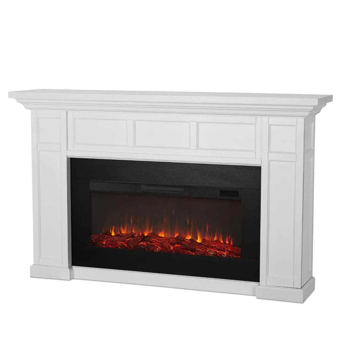 The Alcott features a generous mantel with linear carvings and has a classic, clean style that hints at Modern Farmhouse design. Part of the Real Flame Landscape Series, this widescreen infrared electric firebox is 15″ wider than our standard firebox and mimics the look of real fire, but does not require a chimney or vents.  Features include infrared LED technology, sleek touch controls and dynamic glowing embers. Available in English oak and white.Â