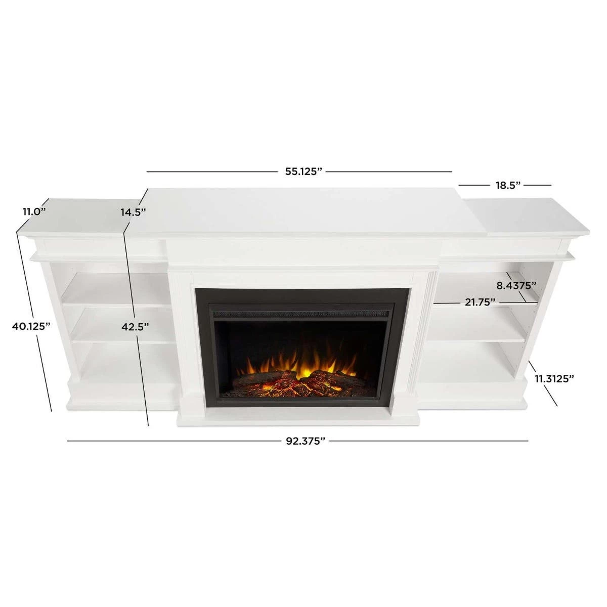 - Fireplace: 92.375″L x 14.5″W x 42.5″H