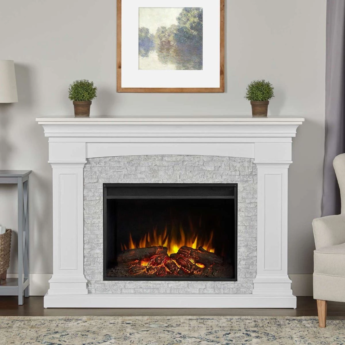 The Deland Grand is a bold take on a classic design with a handsome, elegant style to enhance your home. Exclusively designed, the VividFlame Grand Electric Firebox is 30% larger than our standard firebox and mimics the look of a real fire, but does not require a chimney or vents. Features include infrared LED technology and six thermostat settings. Available in a white finish with a gray faux stone surround or in a gray finish with a black wood surround.