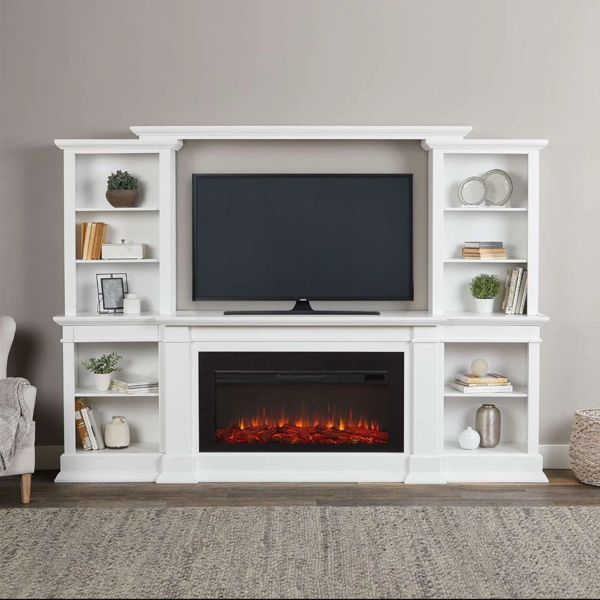 - Includes mantel, electric firebox, remote control, 6′ power cord with lay-flat plug, two anti-topple devices and hardware