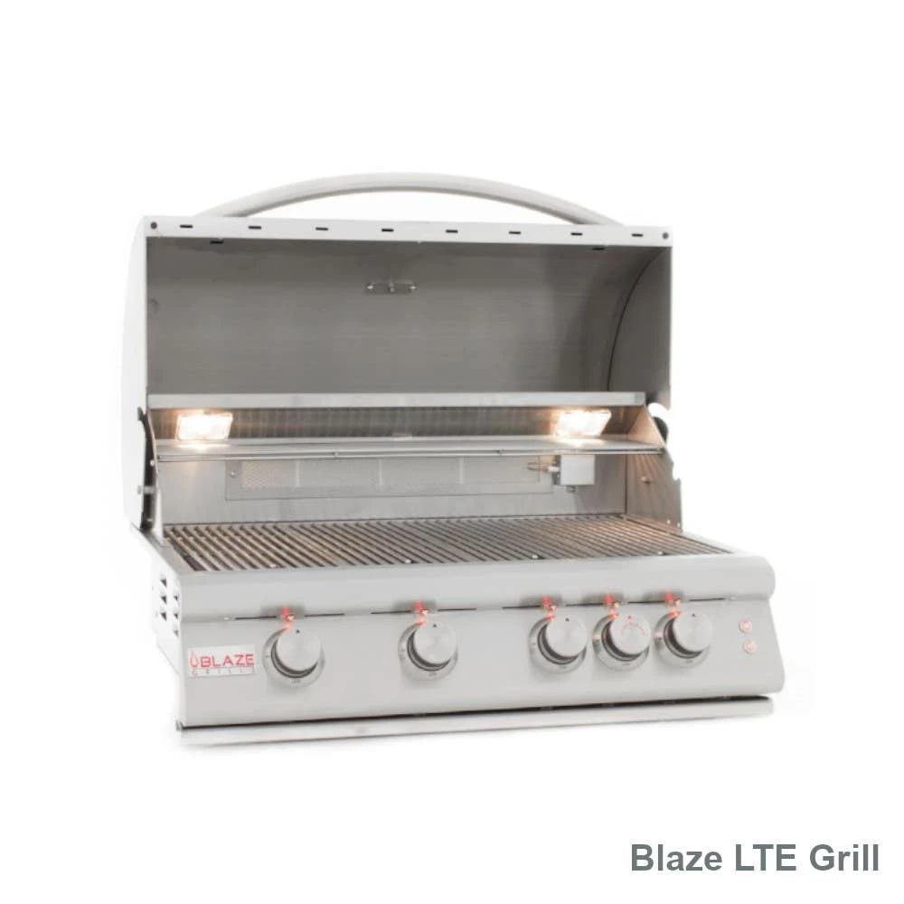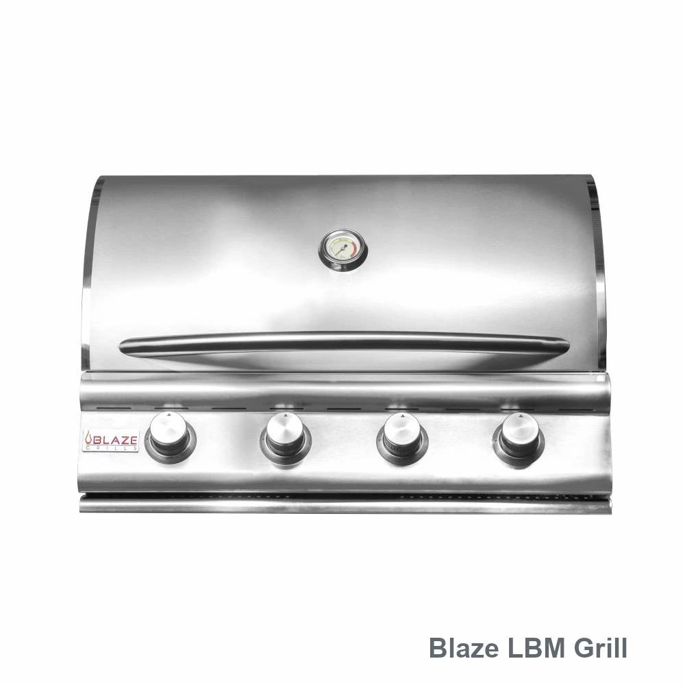 - Includes: Blaze 4 Burner LBM Or 4 Burner LTE Grill, BLZ-SSRF130 Outdoor Fridge, BBQ Direct 32″ Access Doors, and BBQ Direct Double Drawer Kit