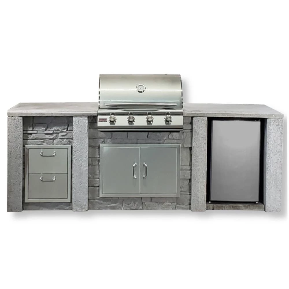 Stone Kitchens Primo Chef Island is the perfect size grill island for those looking for a little counter space with all the amenities. Choose from the solidly built Blaze 4 burner LBM Grill or the Blaze 4 burner LTE Grill with all the additional accessories you will need in a grill. The Stainless Steel BLZ-SSRF126 Refrigerator will keep your drinks cool while your grill gets hot. Stainless Steel Double Access Doors give you storage space as well as access to the cavity below the island. Store all the items you need on the ready in the included Double Drawer Kit