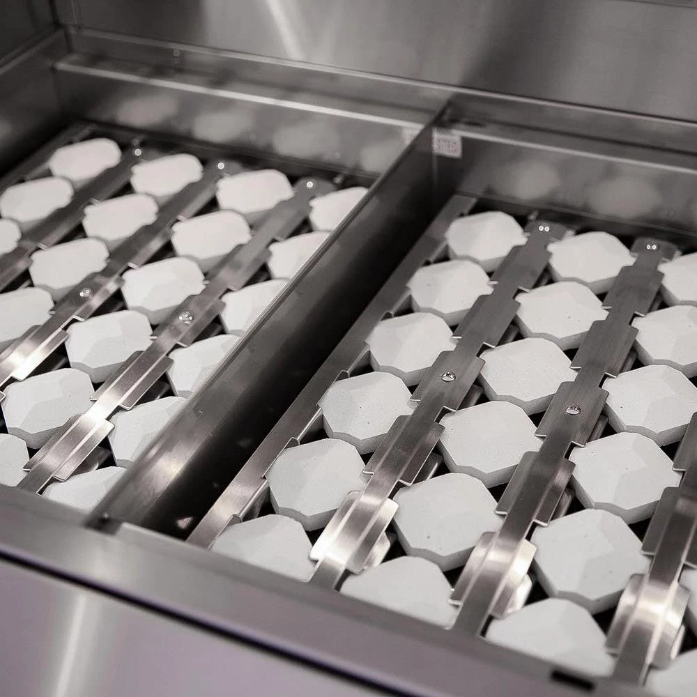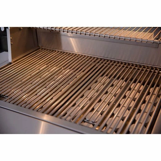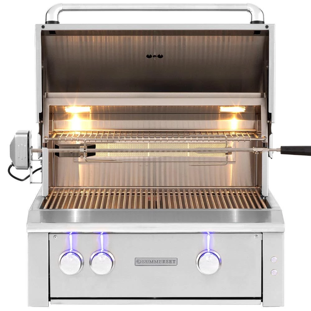 The Summerset Alturi Series of grills are proudly made in the USA! They are custructed of rugged 304 grade stainless steel. Choose from high quality/high output cast red brass (“R” Models) OR cast stainless steel (“T” Models) burners that are 26,000 BTUs each. Each grill features a 304 stainless steel briquette rack and ceramic briquettes. The briquettes and briquette rack provide a smokey flavor while providing even heat and reducing pesky flare ups. The Alturi grills also come standard with a rear rotisserie burner, a rotisserie, interior halogen lights, 23/64″ thick 304 stainless steel cooking grids, assisted lid lifting hinges, and commercial polishing.