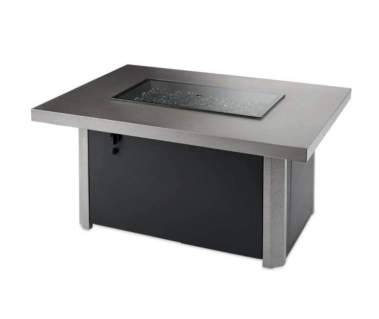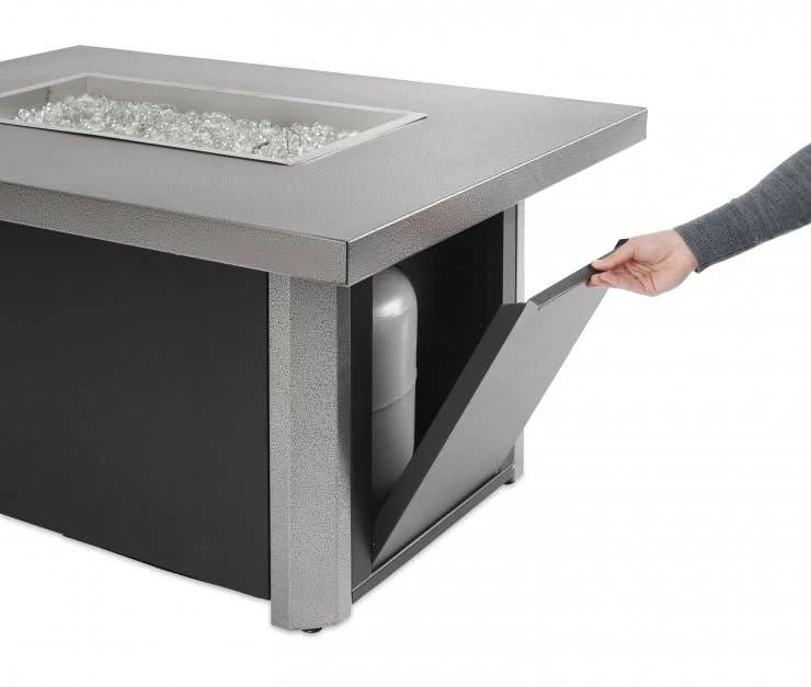 The Outdoor GreatRoom Company CAD-1224 Caden Fire Pit Table brings a modern feel to your outdoor living space. The entire table is constructed with galvanized steel with the top and legs powder-coated in pewter crater and the base powder-coated black. The 12″ x 24″ Crystal Fire rectangular burner (CF-1224) that comes included is built with stainless steel, UL-listed for safe operation, and is rated for up to 55,000 BTU. Diamond-colored fire glass is also included to fill out the burner pan. The Caden fire pit table is compatible for both Natural Gas and Propane configurations and even includes propane tank storage in the base of the table (up to 20 lbs). Everything required for either fuel configuration is included with this fire pit table.
