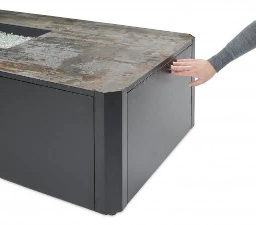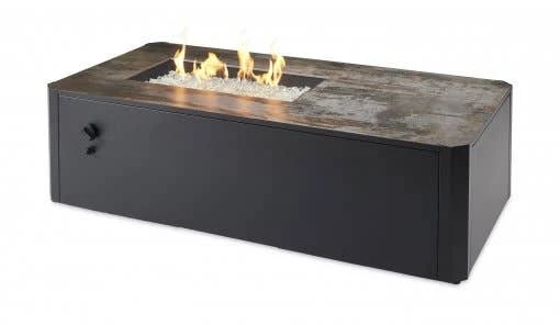 The Outdoor GreatRoom Company Kinney Gas Fire Pit Table features an ultra-modern design that is perfect for entertaining. The low-profile base meets a contemporary top to ensure your focal point is the main attraction on your patio. Extra tabletop space makes it convenient for entertaining guests. Gather everyone around the 12â x 24â Crystal Fire® Plus burner (CF-1224) for a cozy, relaxing time.