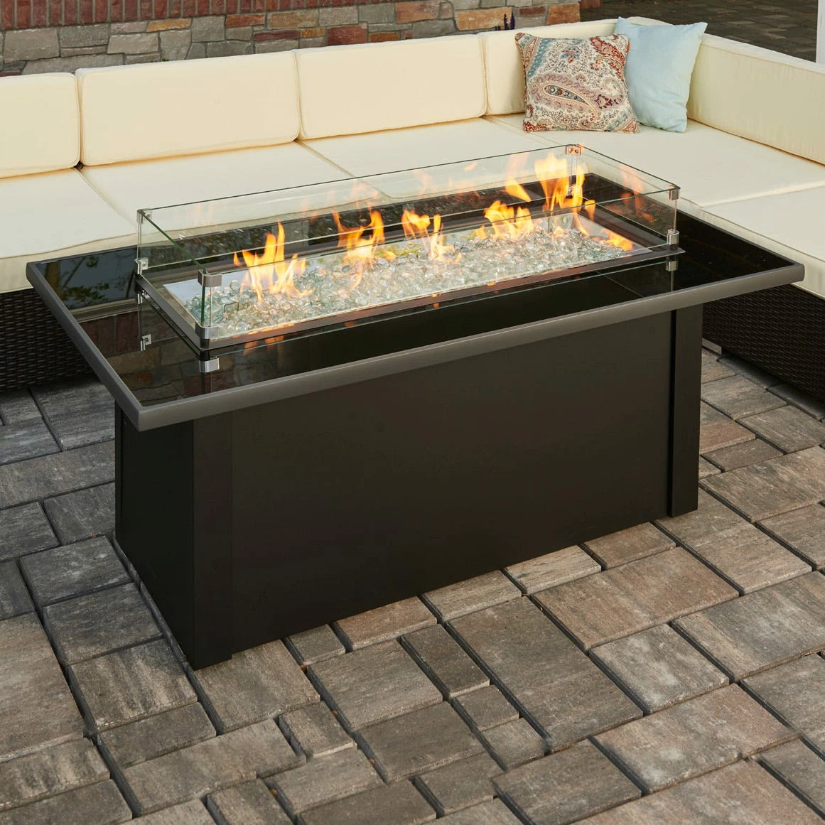 The Monte Carlo Linear Gas Fire Pit Table looks as beautiful as it is durable. Black tempered glass top with Black powder coated metal base. Grey Glass Burner Cover included. Includes a 12″ x 42″ Stainless Steel Crystal Fire Burner.Stainless Steel Crystal Fire Burners are made from high quality Stainless Steel (commercial grade #304) and include tempered fire glass gems and ignition controls. Each burner is UL listed for safety and quality. They work with Outdoor Great Room’s line of fire pit tables or can be purchased separately for custom-built fire pits and projects. Crystal Fire Burners can run for 8-16 hours using a 20 lb. propane tank or can be hooked up to a natural gas line. Adjust the flame height to your desired setting and enjoy. With just the push of a button, a beautiful clean-burning fire appears atop a bed of tempered fire glass gems. Optional Electronic Ignition Systems allow for use with wall switches or remote controls. The electronic ignitions have the necessary certifications for commercial applications.